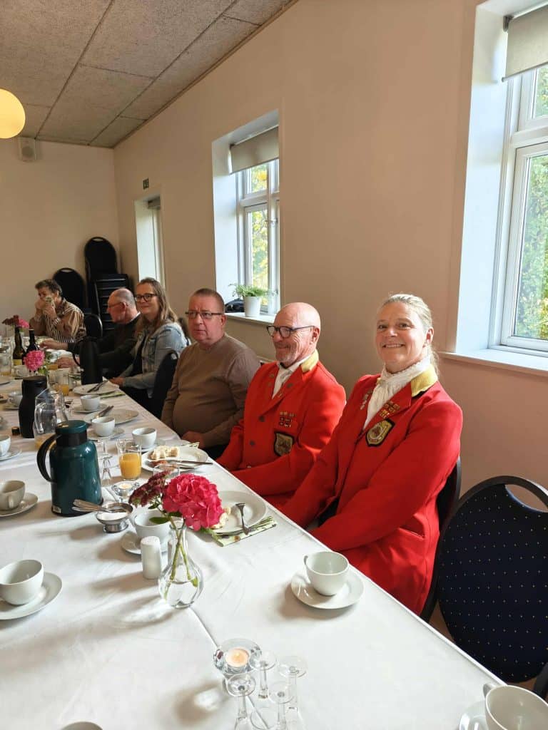 Pjat til side. Preben stod straks glad i døren og tog godt i mod os. Vi blev budt til det store morgenmadsbord. Hold dog op alt den mad. Andre jydske ryttere var allerede mødt op, alle i vores smukke uniform. Vi fik en familie fremvisning, og Preben fik en tale samt et rytter hurra. Vi drev hjem over, for “at gøre plads“ til et nyt hold jydske jagtryttere. 70 gæster var forbi på dagen, og der blev budt på fiskebord, lune lækkerier og et godt, solidt pålægsfad efterfulgt af kaffe og kagebord.